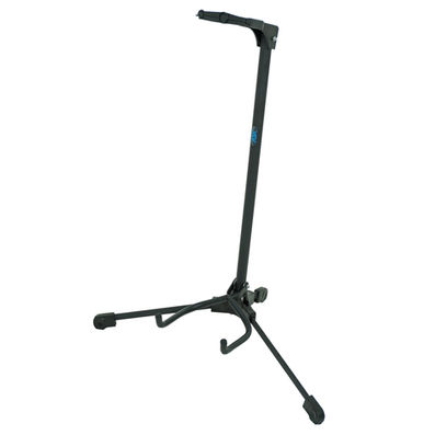 Suporte de estúdio intermediário preto para violão, guitarra, baixo, baixolão ou viola, design minimalista ocupando pouco espaço na ambiente permitindo o posicionamento estratégico nos cantos sem atrapalhar a movimentação, tripé com diâmetro aumentado para garantir maior estabilidade facilitando o uso e mudança rápida de instrumento no suporte, apoio de braço com trava, descanso de corpo, produto semi-retrátil.